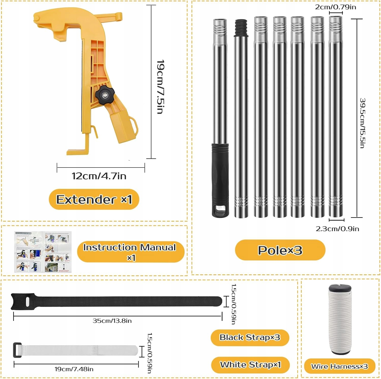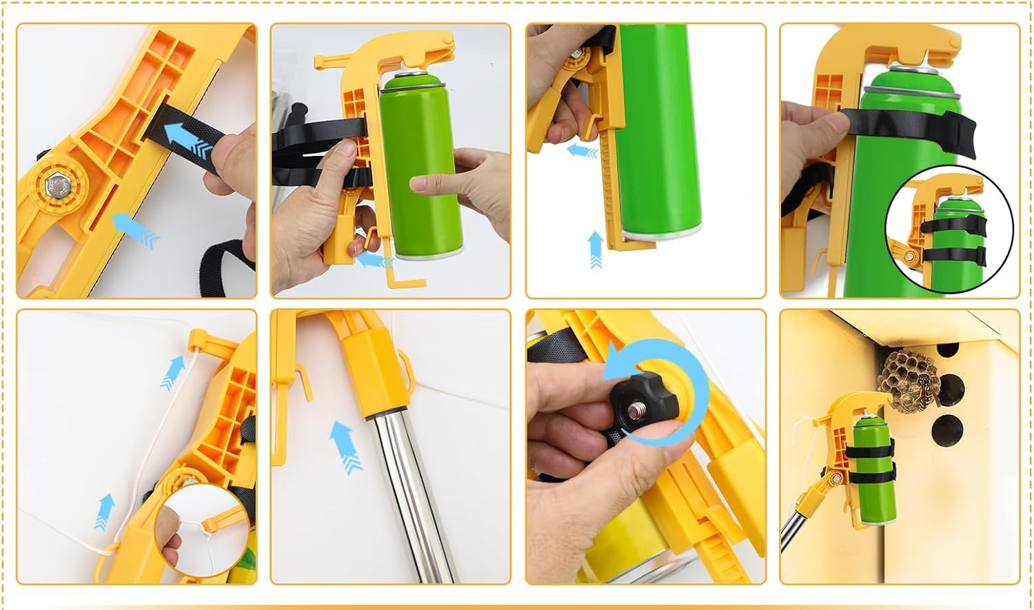 ➡️JAK UŻYWAĆ?Przymocuj dwie taśmy rzepowe do głównej części urządzenia.(Zwróć uwagę na położenie otworów).Dopasuj ruchomy uchwyt naciskowy oraz dolny zacisk do rozmiaru puszki i ustaw kąt natrysku.(Przed regulacją upewnij się, że pociągnąłeś za zacisk naciskowy do tyłu).Po ustawieniu pozycji zacisku dociśnij uchwyt mocno.Przymocuj puszkę mocno za pomocą taśm rzepowych.(Upewnij się, że rzepy są dobrze dociągnięte, aby zapobiec poluzowaniu i problemom podczas używania).Po zamontowaniu przeciągnij sznurek przez otwór w interfejsie zacisku naciskowego, następnie przełóż go przez górny otwór i zawiąż, aby zabezpieczyć.Zamontuj uchwyt przedłużający na drążku.Obróć nakrętkę sześciokątną przeciwnie do ruchu wskazówek zegara, aby ustawić kąt interfejsu drążka przedłużającego, tak aby idealnie trafić w wybrany cel.Stojąc na ziemi, możesz łatwo i swobodnie rozpylać środek na osy, gniazda szerszeni, farbę itp.