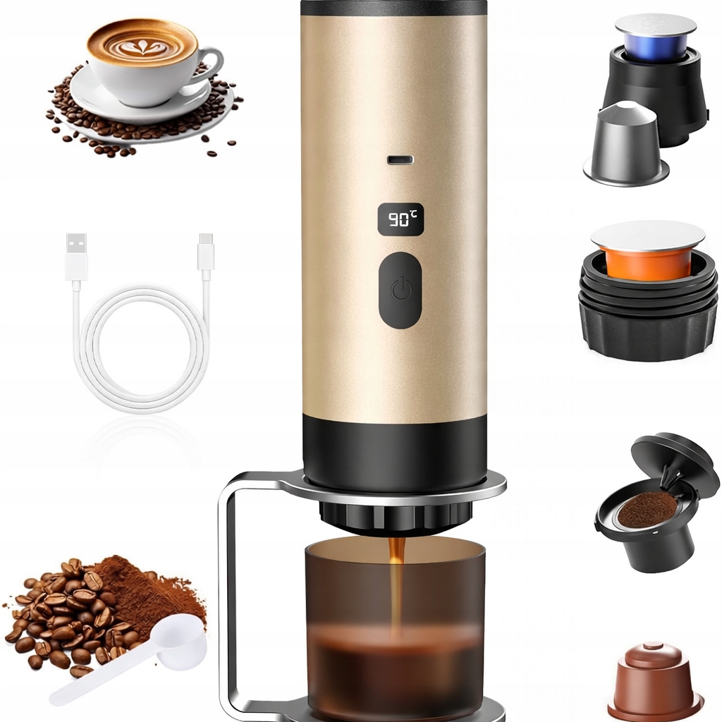 ⭐Bezprzewodowy Ekspres Przenośny 3w1 Kapsułki Kawa Mielona USB-C Szampański⭐