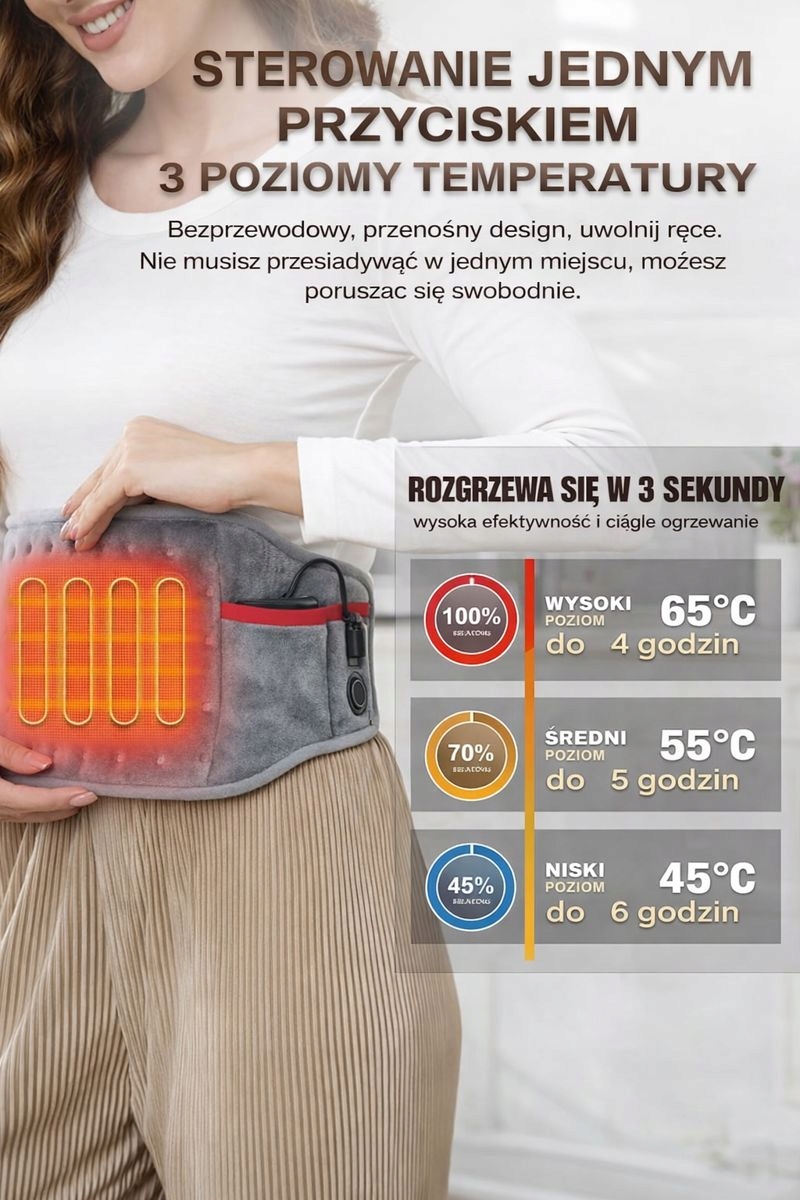 ❇️ 3 poziomy temperatury i błyskawiczne nagrzewaniePas nagrzewa się już w ok. 5 sekund ➡️ łatwo dopasujesz intensywność do swoich potrzeb.✔️ Niski – do 6 h pracy✔️ Średni – do 5 h pracy✔️ Wysoki – do 4 h pracy✔️ Inteligentne przełączenie na tryb średni po 5 minutach bezczynności