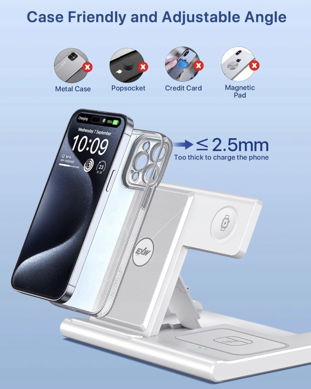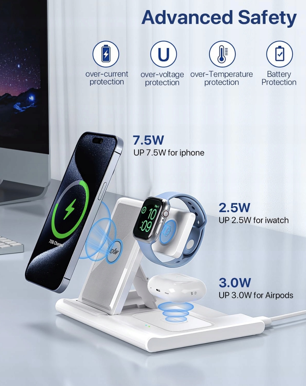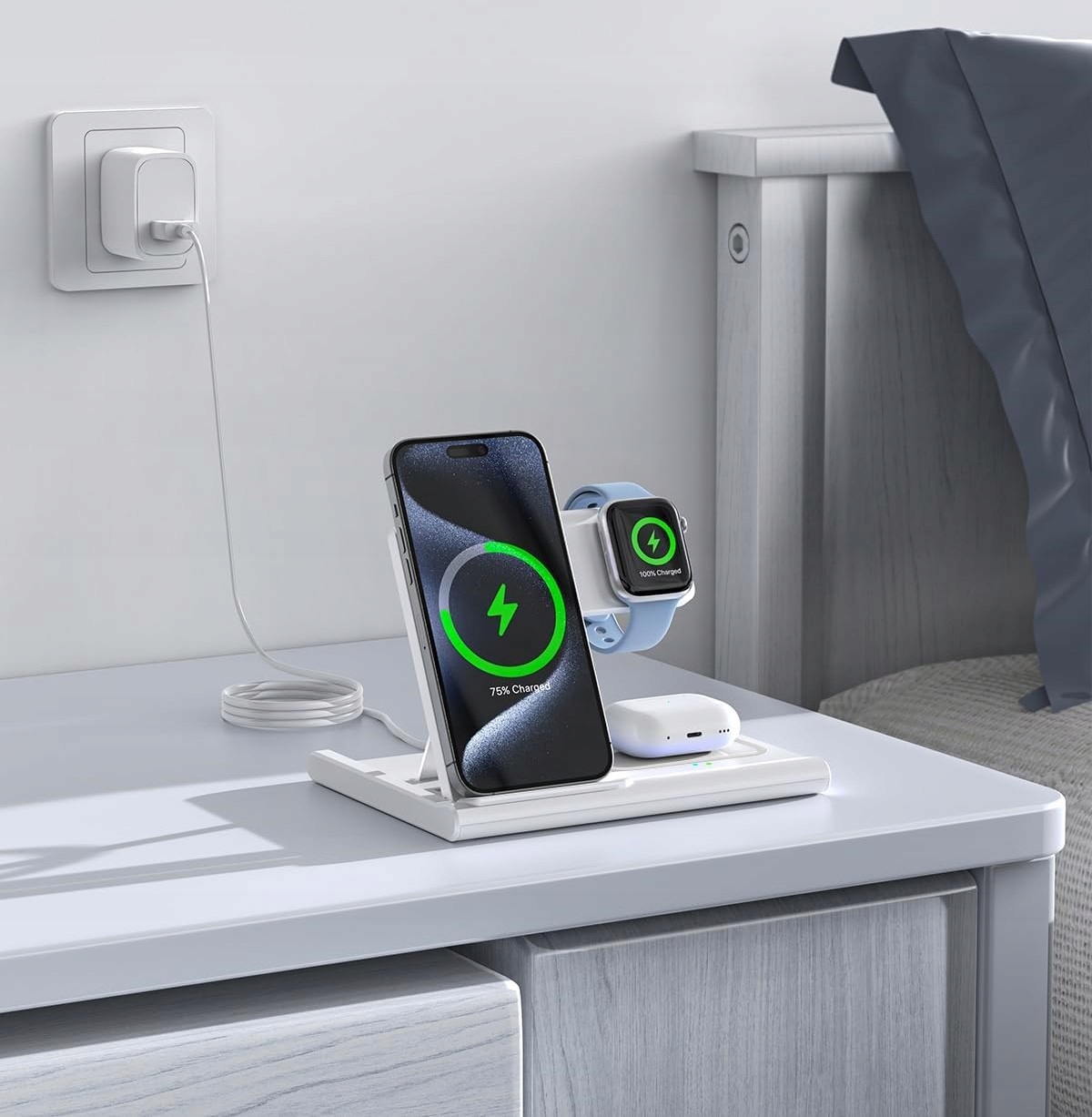 ❇️Ładowarka bezprzewodowa, składana ładowarka bezprzewodowa 3 w 1 do Apple Watch | Airpods | Szybka stacja ładowania bezprzewodowego do iPhone’a (bez adaptera)Jednoczesne ładowanie wielu urządzeń: Stacja ładowania bezprzewodowego 3 w 1 obsługuje trzy urządzenia – iPhone’a, AirPods i iWatch – które można ładować jednocześnie; (nie jest kompatybilna z iWatch 1 i AirPod 1).Szybkie ładowanie: Kompatybilna ze stacją ładującą iPhone 16, ma technologię bezprzewodową i 2 cewki ładujące. Wysokowydajny chipset zapewnia 10 W szybkiego ładowania dla serii iPhone 12-16/Samsung Galaxy (nie używaj zbyt grubego etui).Ładowarka bezpieczeństwa: Kompatybilna ze stacją ładowania bezprzewodowego Apple Watch 9, przeszła certyfikację CE i FCC. Wbudowane 2 cewki i inteligentny układ, inteligentny system ochrony prądu, rozsądna konstrukcja wewnętrznego obwodu.Łatwy do przenoszenia: Niewielki rozmiar sprawia, że można go łatwo używać w domu lub w podróży, można go łatwo schować do kieszeni.❇️W zestawie:1* Ładowarka bezprzewodowa;1* Kabel typu C;1* Instrukcja użytkownika w języku angielskim.