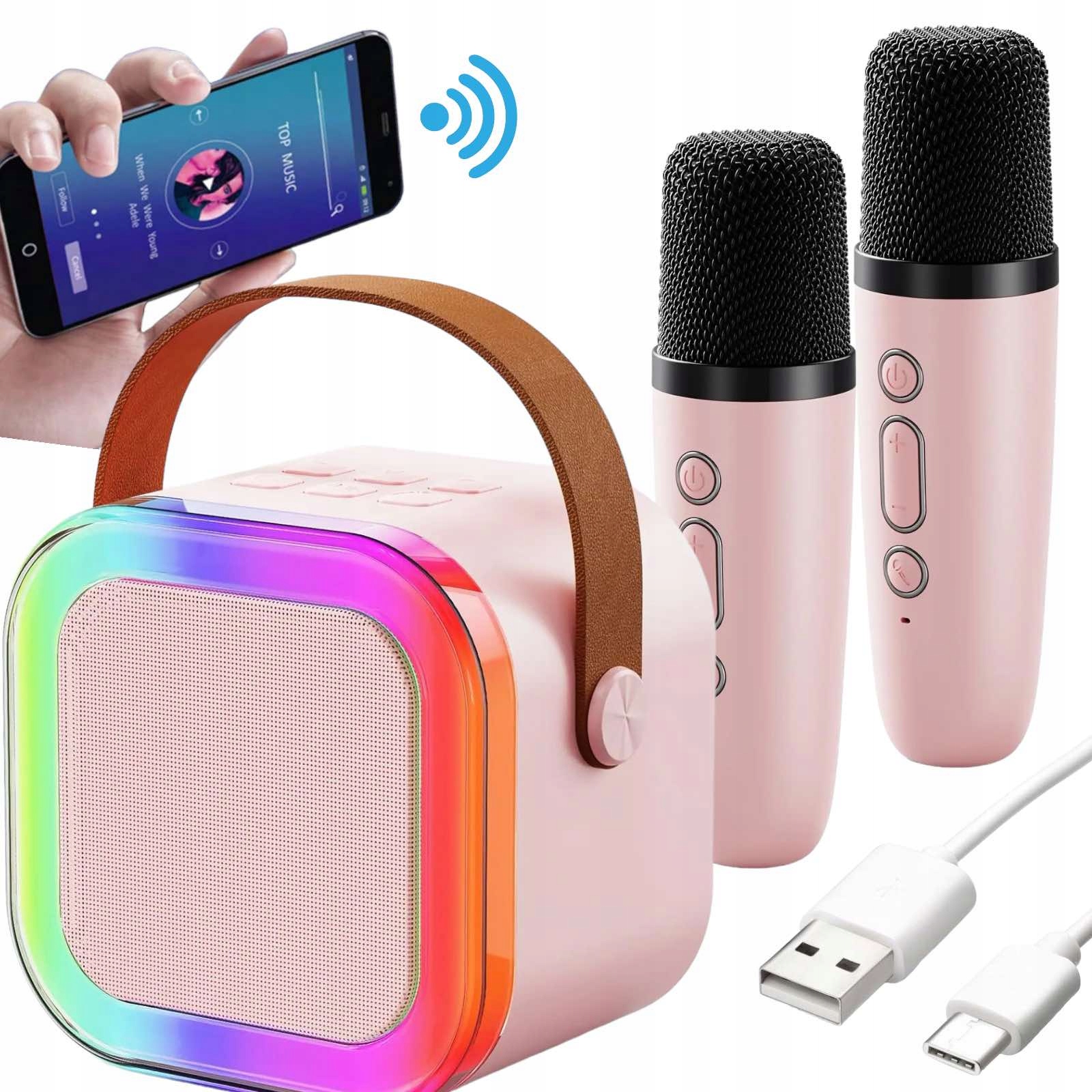 ⬇️ Specyfikacja techniczna Bluetooth: v 5.0 Moc głośnika: 6W Zasięg: 10 m Typ portu wyjściowego: USB-C Napięcie wejściowe: 5V=0.5A Kolor: Różowy ⬇️ Zawartość zestawu 1 x Głośnik bezprzewodowy Bluetooth z LED 2 x Mikrofony bezprzewodowe 1 x Kabel USB-C 1 x Instrukcja obsługi