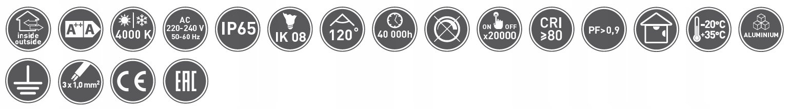 ✔️Certyfikat EAC: tak✔️Certyfikat CE: tak✔️Współczynnik oddawania barw: ≥80✔️Klasa ochronności przed porażeniem elektrycznym: I✔️Stopień ochrony IK: 08✔️Współczynnik mocy PF: >0,9✔️Nie współpracuje ze ściemniaczem: tak✔️Trwałość średnia [h]: 40000✔️Miejsce montażu: ściana, sufit✔️Liczba cykli załącz/wyłącz: 20000✔️Kąt świecenia [⁰]: 120✔️Stopień ochrony IP: 65✔️Częstotliwość [Hz]: 50-60✔️Napięcie zasilania [V]: 220-240✔️Zasilanie: prąd zmienny✔️Klasa energetyczna: A++, A✔️Kolor: szary✔️Materiał: aluminium, szkło✔️Strumień świetlny [lm]: 10000✔️Temperatura barwowa światła [K]: 4000✔️Moc źródła światła lub urządzenia [W]: 100