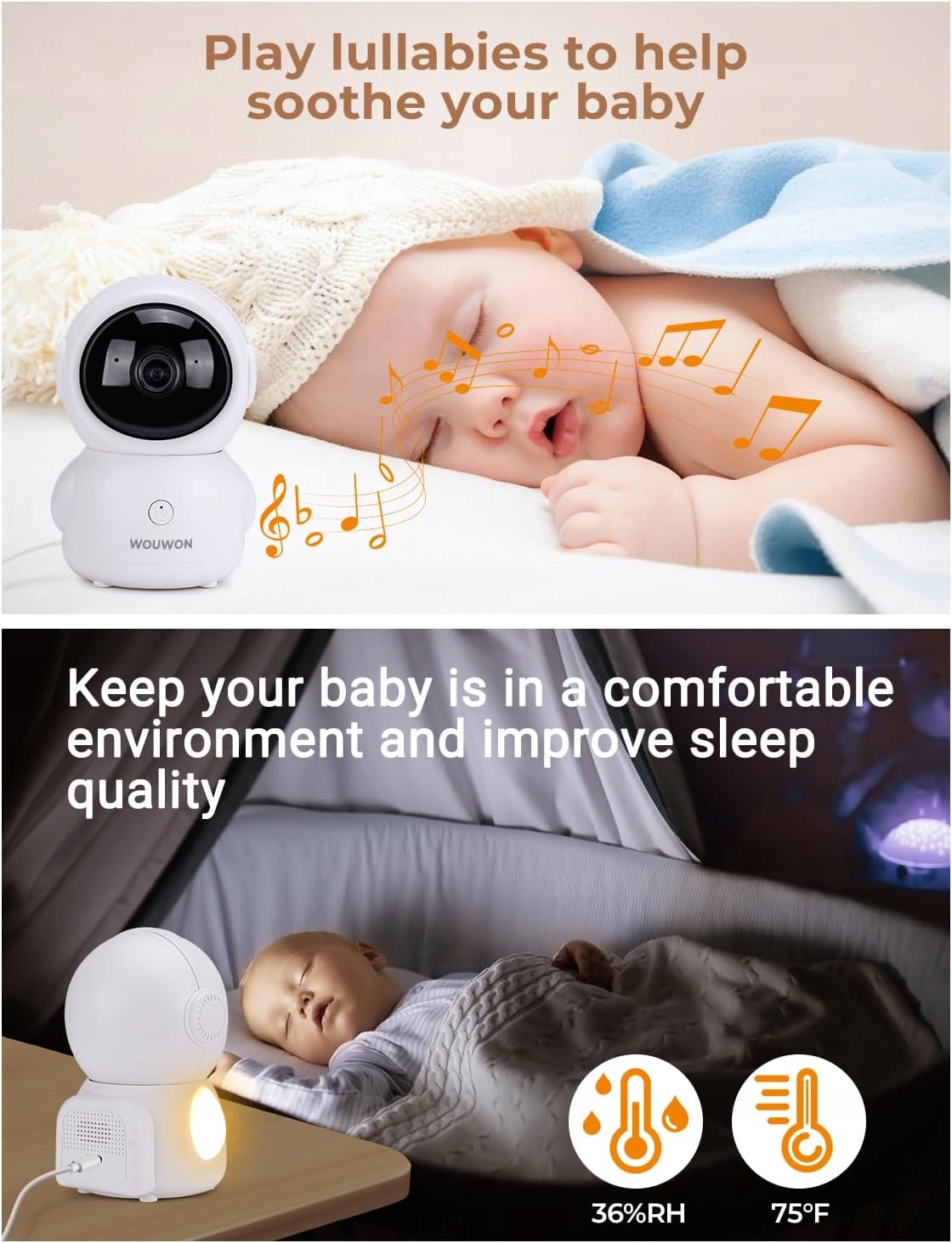 ⭐ Kołysanki, światło RGB i rozmowa dwukierunkowa✨ 14 kołysanek – zdalne włączanie✨ Kolorowe światło RGB – uspokaja i tworzy klimat✔️ Dwukierunkowy audio – mów do dziecka z telefonu➡️ Przycisk szybkiego połączenia dla dziecka