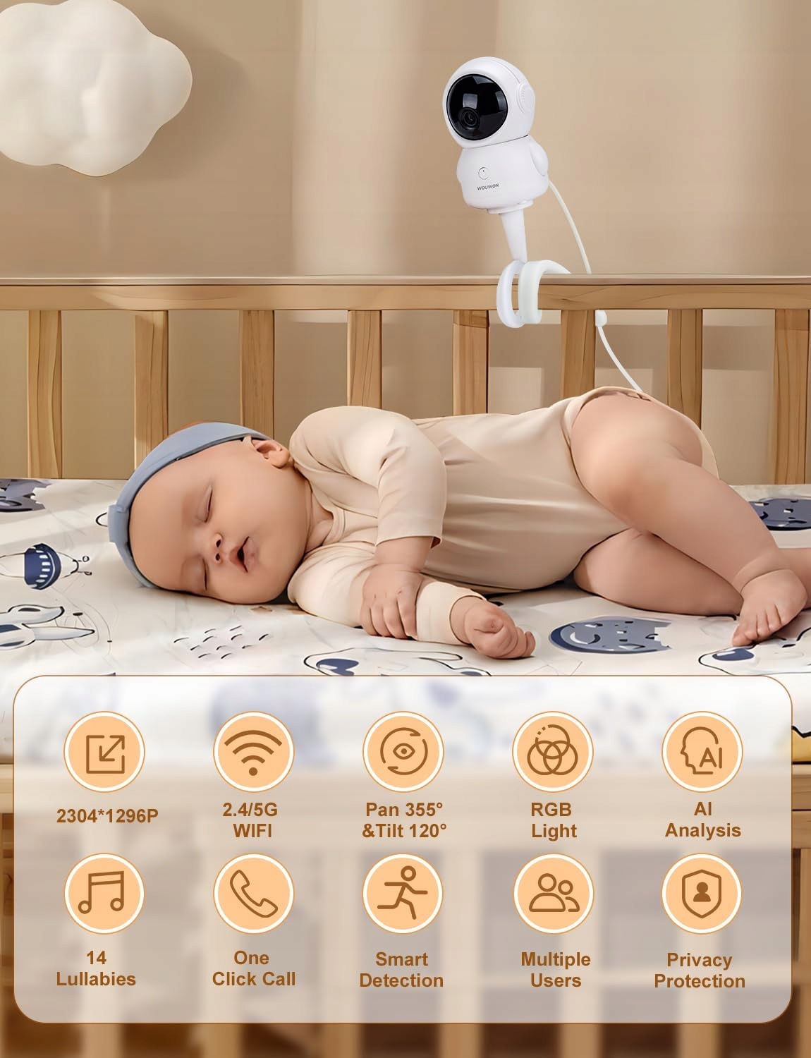 ❇️ Dlaczego warto?✔️ Wysoka jakość obrazu 2K✔️ Inteligentne alarmy i monitoring✔️ Funkcje uspokajające dla dziecka✔️ Idealna do pokoju niemowlęcego