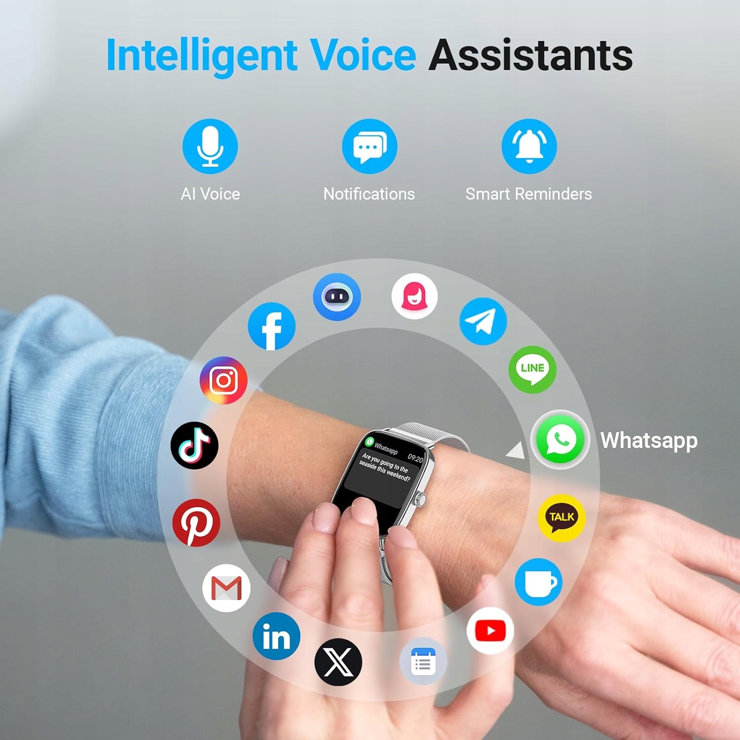 ✔️ Dodatkowe funkcje: sterowanie muzyką, prognoza pogody, budzik, kontrola aparatu, stoper, przypomnienia i więcej.