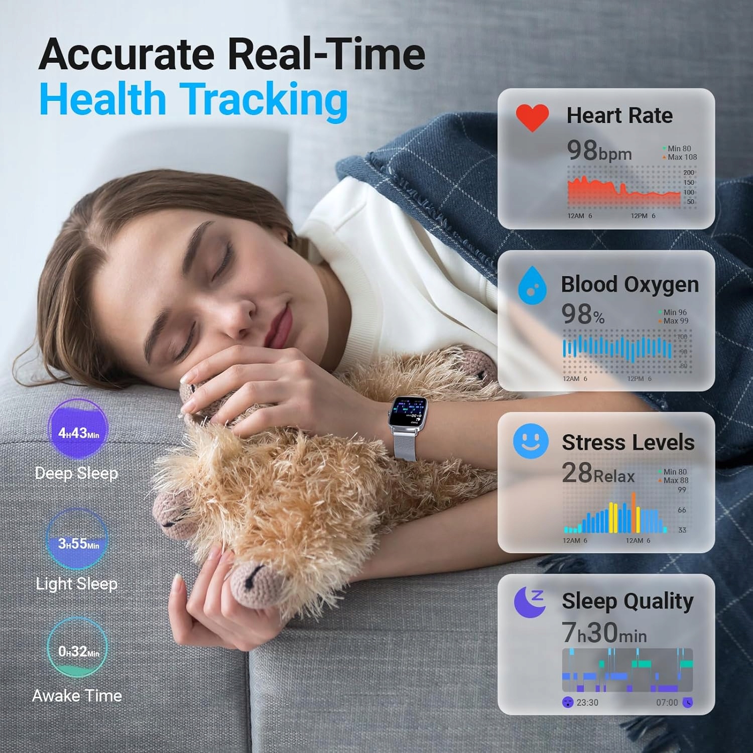 ✔️ Automatyczny monitoring snu: fazy snu głębokiego, lekkiego i wybudzenia.