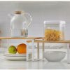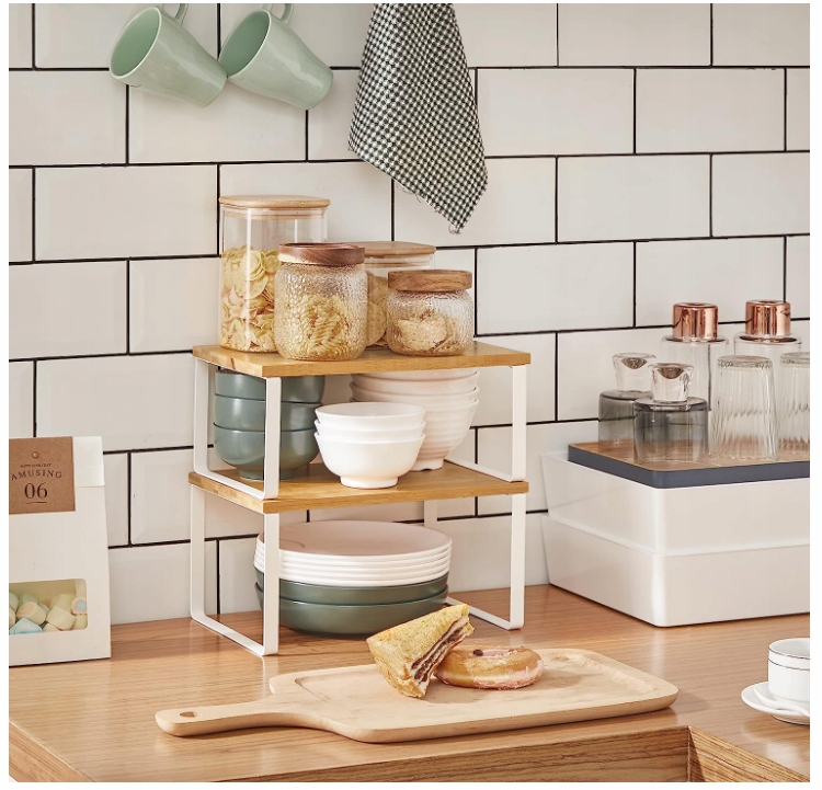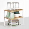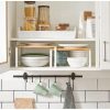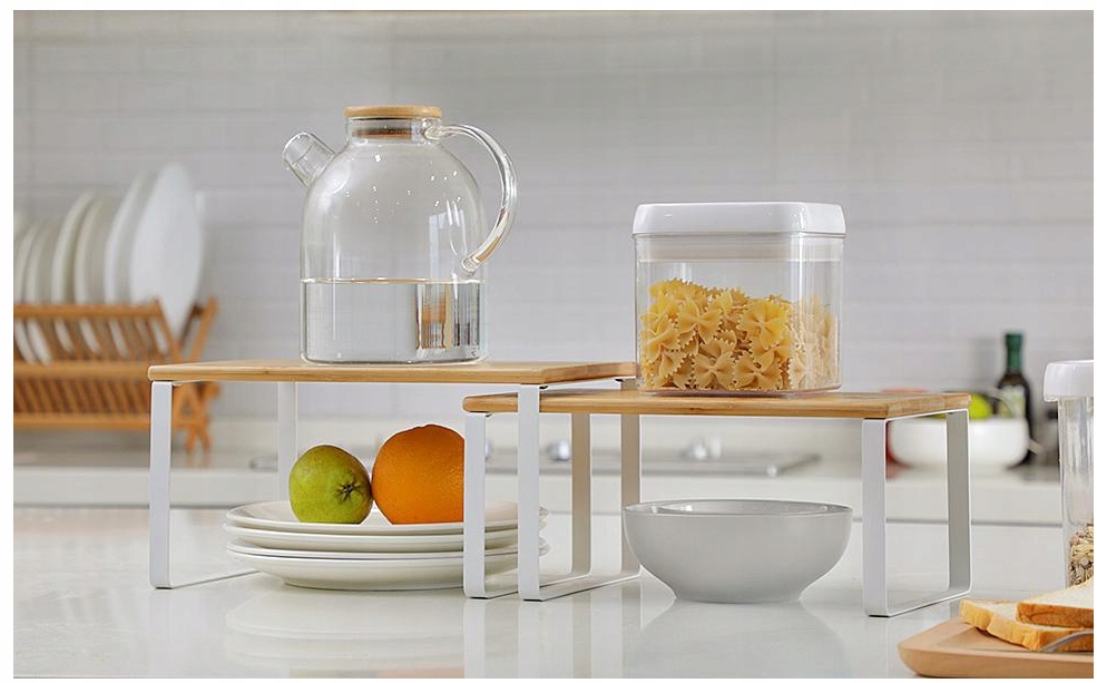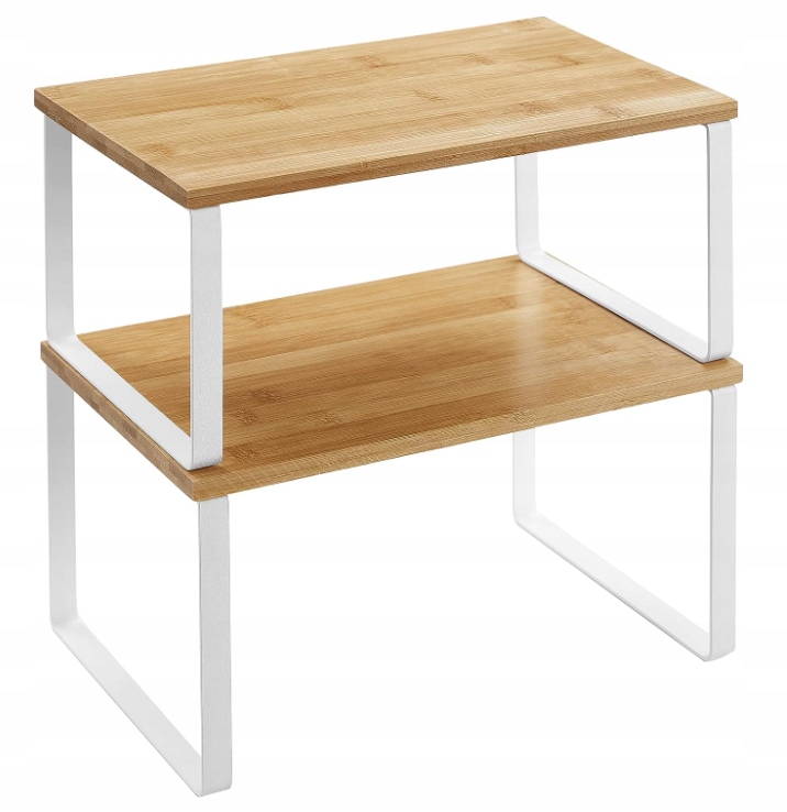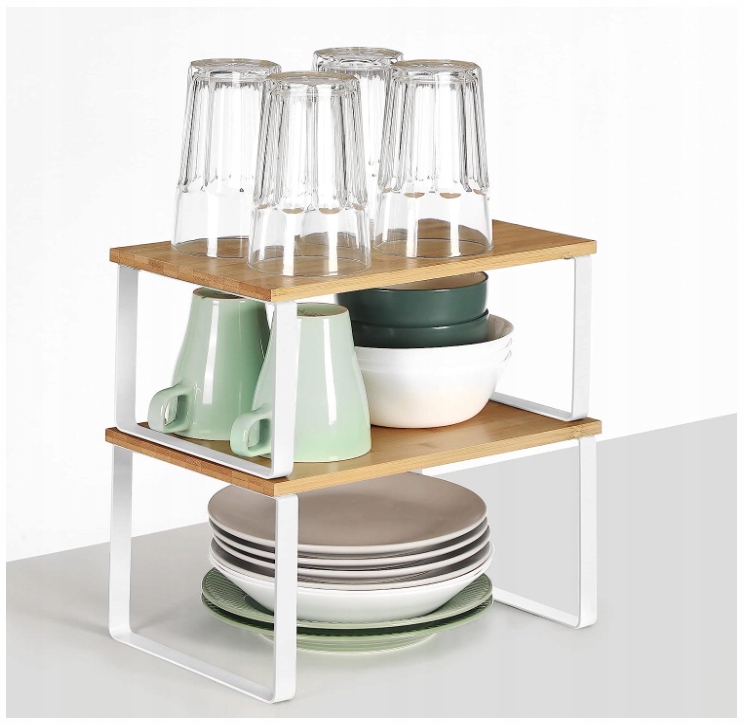 Umieść półki w szafce lub na blacie kuchennym, aby stworzyć więcej miejsca do przechowywania i więcej opcji przechowywania słoików z przyprawami, szklanek, misek i innych.