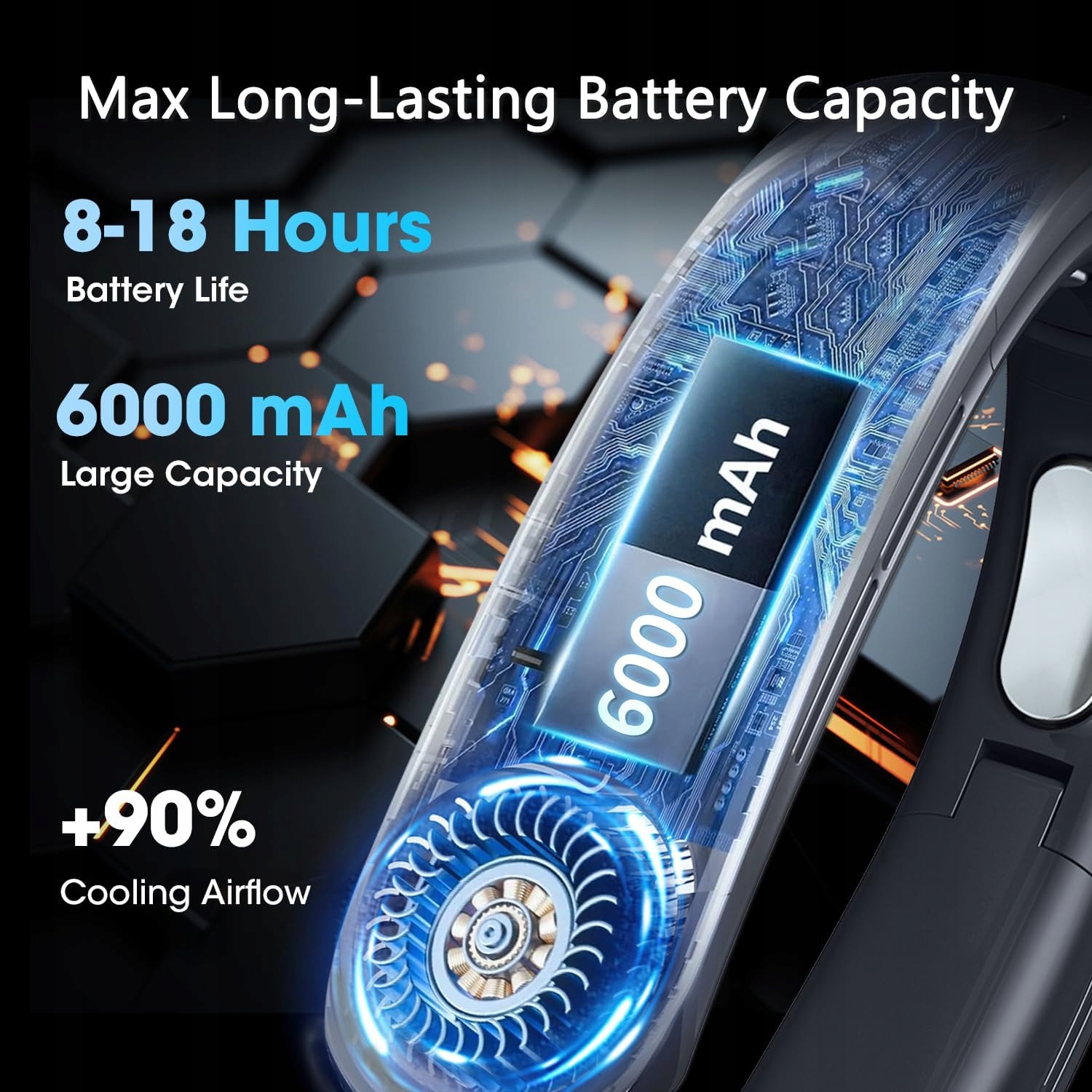 ✔️ Akumulator 6000 mAh – do 18 h pracy (tryb niski) lub ok. 8 h na najwyższym biegu