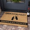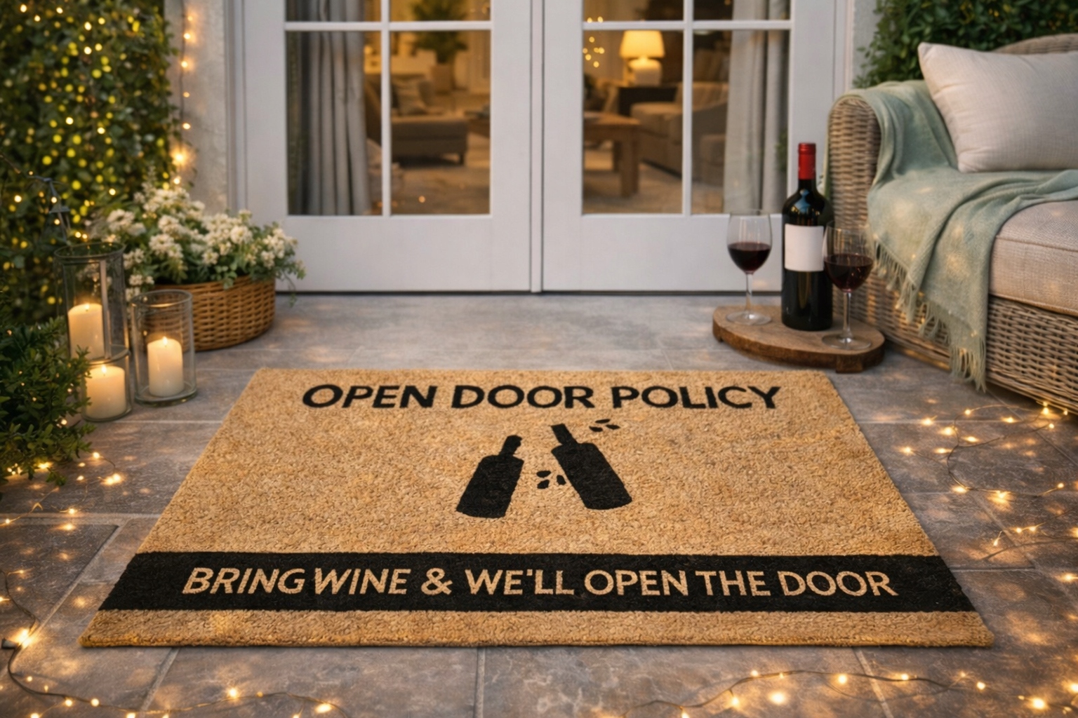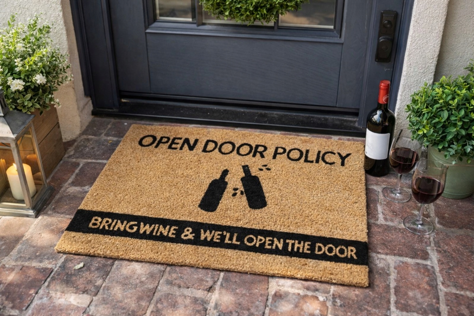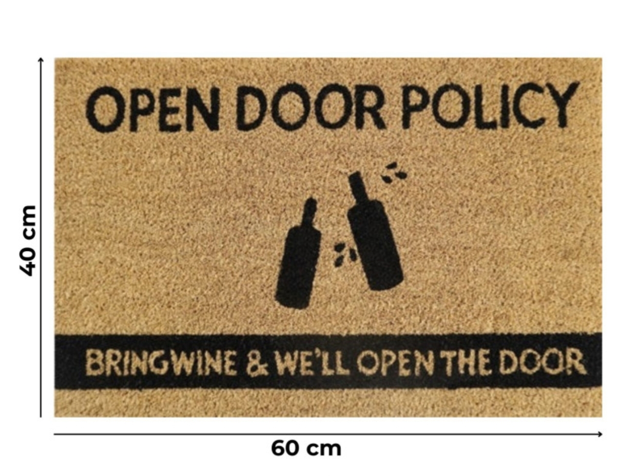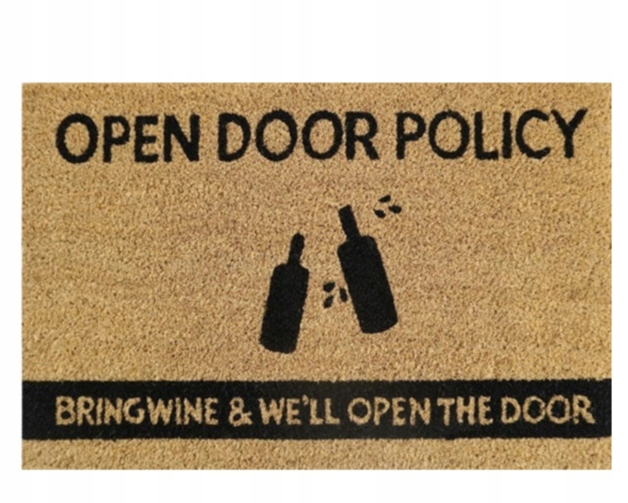 ⭐Wycieraczka kokosowa Open Door 40×60 cm antypoślizgowa⭐✨Wycieraczka kokosowa Open Door⭐ Naturalna wycieraczka z napisem „Open Door Policy. Bring wine & We’ll Open The Door” do domu i na zewnątrz